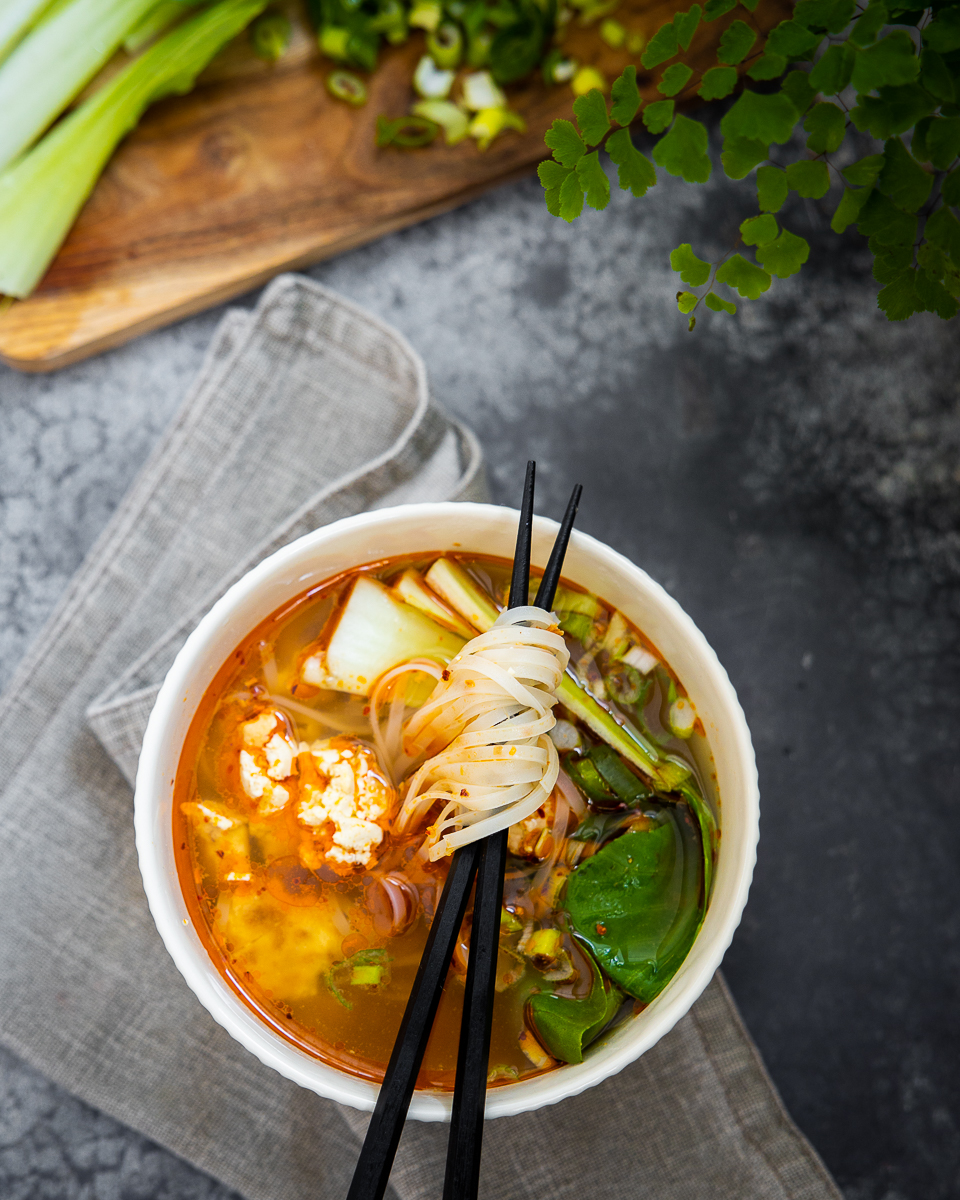 Paljon tämän helpommalla ei enää saa ruokaa pöytään! Tämä ihana nuudelikeitto valmistuu yhdessä kulhossa. Ensin sekoitetaan mausteet kulhon pohjalla, sen jälkeen lisätään nuudelit, kieuhuva vesi sekä tofua, vähän kasviksia ja chiliöljy. Koko homman tekemiseen menee vain hetki.