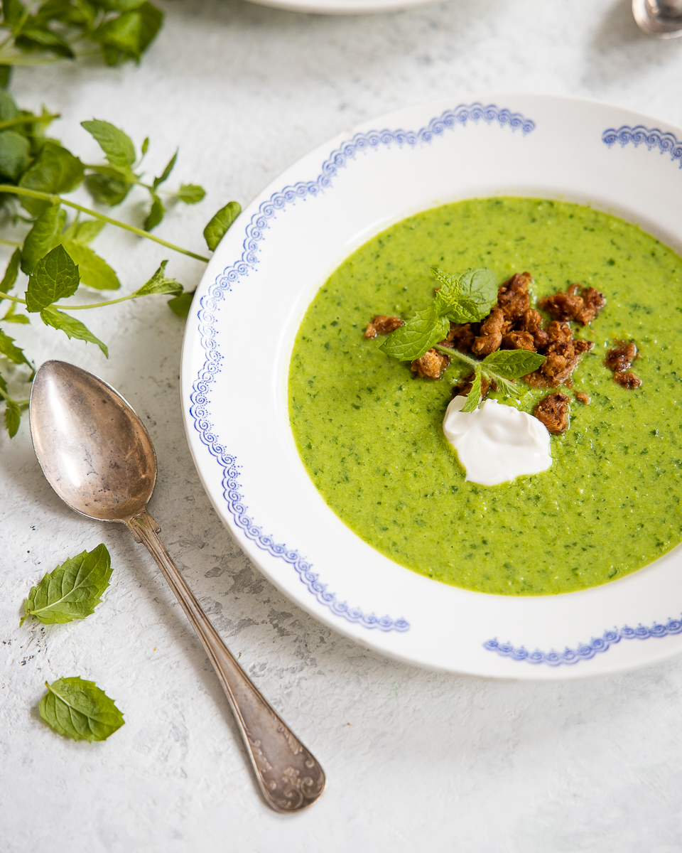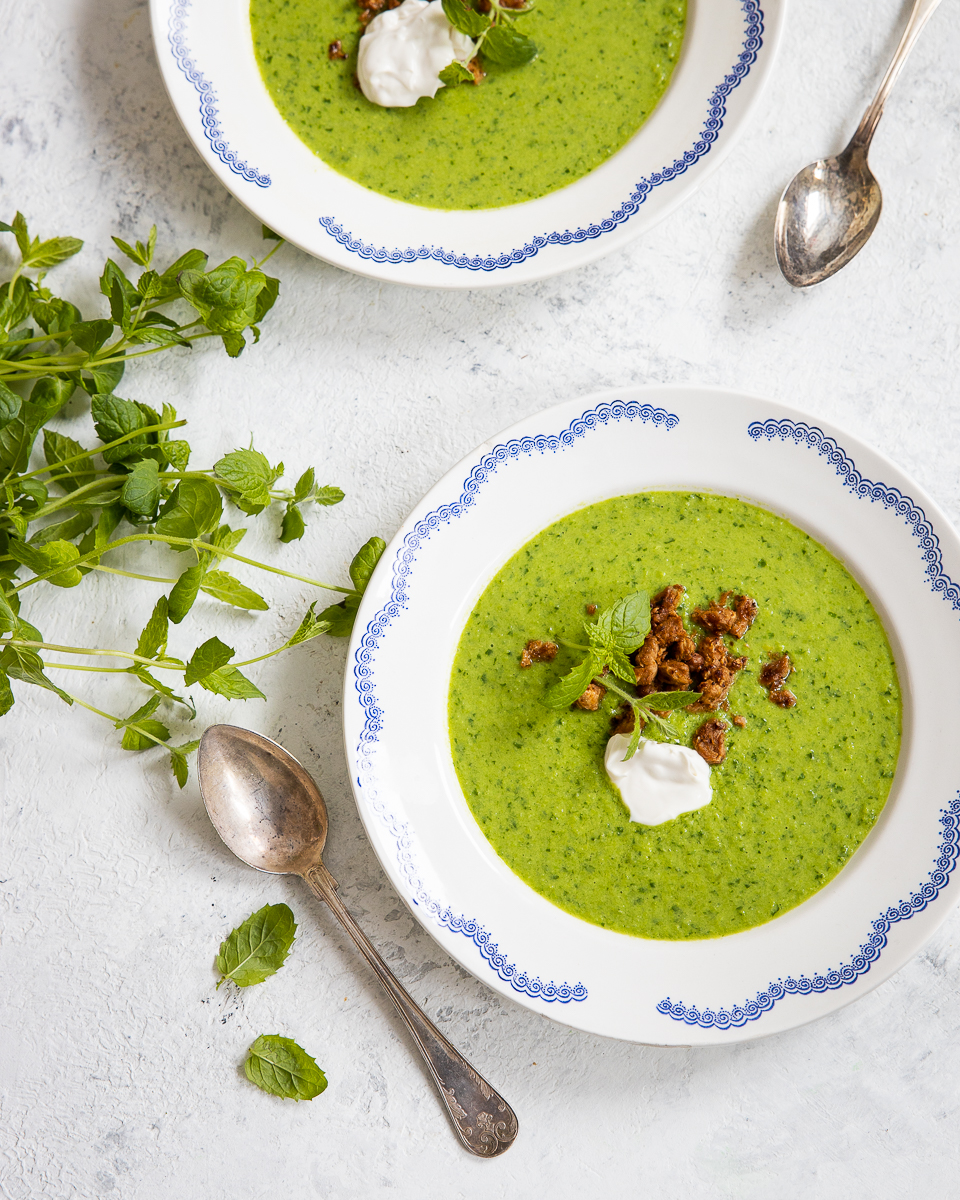5. Annostele keitto lautasille ja lisää päälle vegepekoni. Koristele halutessasi kauraranskankermalla ja mintunlehdillä.