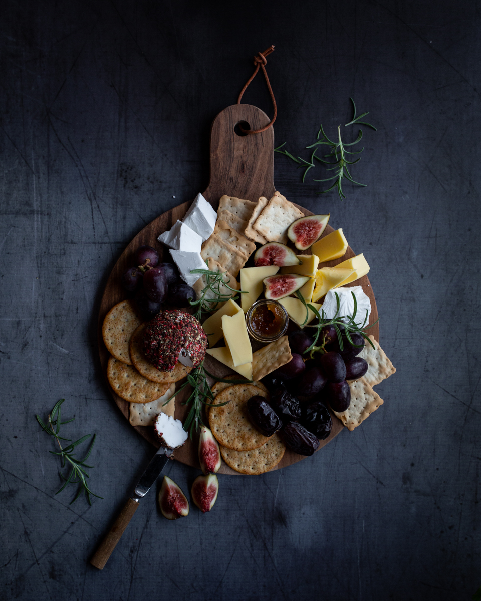 Kokoa juustotarjotin vegaanisista juustoista, suolakekseistä, taateleista, viikunoista, rypäleistä ja hilloista.