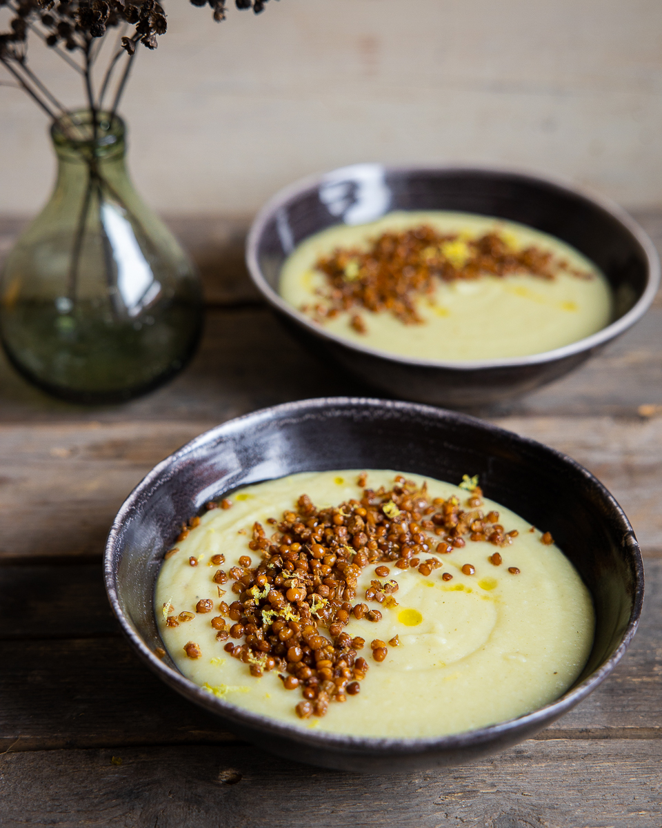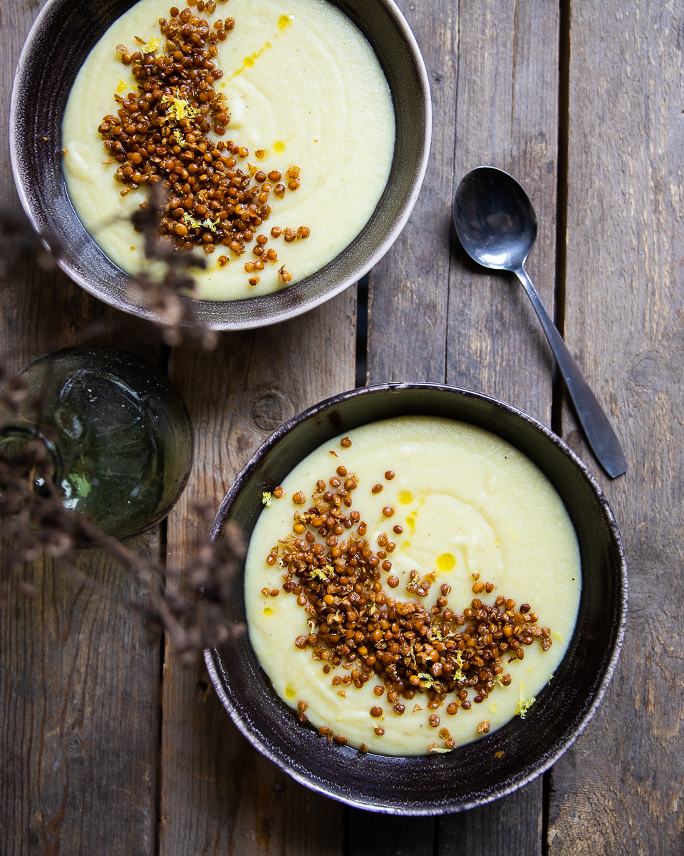 Sitruunainen juuripersiljakeitto viimeistellään uunissa paahdetuilla linsseillä.