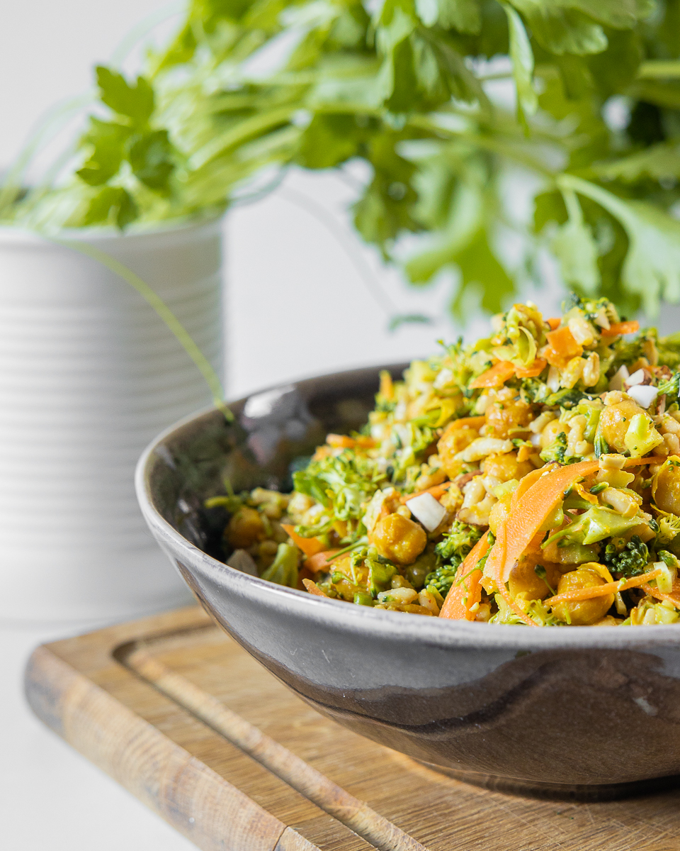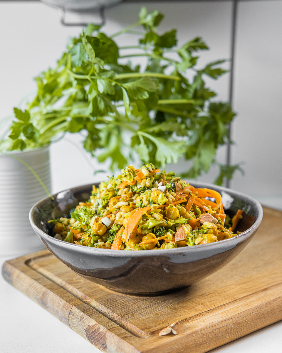 Rakastan erilaisia salaatteja ja syön niitä paljon myös talvikaudella. Tähän aikaan vuodesta jätän usein lehtisalaatin ja kesäiset tomaatit ja kurkut väliin ja teen salaatit sen sijaan esimerkiksi erilaisista kaaleista, porkkanoista ja fenkolista. Pieneksi leikattu parsakaali on yksi ikisuosikkini salaateissa. Porkkanan, kevätsipulin, kikherneiden ja ohran kanssa siitä tulee ihana salaatti, joka viimeistellään maapähkinäkastikkeella.