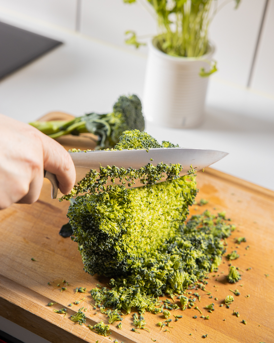 3. Leikkaa parsakaalin nuput ihan pieneksi silpuksi. Käytä hyödyksi myös parsakaalin varsi: kuori se ohuelti ja silppua hienoksi. Helpoiten homma käy ison keittiöveitsen avulla!