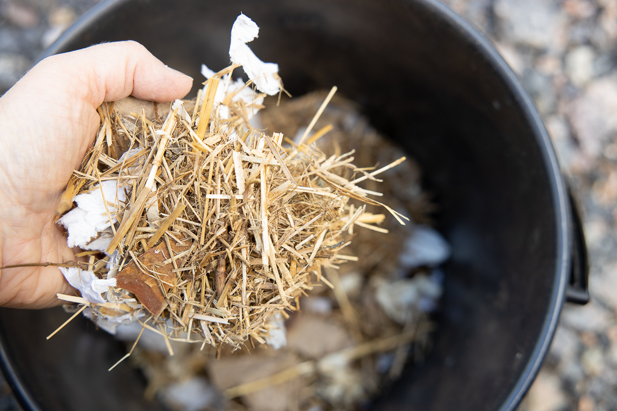 Olen itse ratkaissut kuivikeongelman käyttämällä Kiteen Mato ja Multa Oy:n valmistamaa kompostikuiviketta (tilaan täältä), joka tehdään rehevöityneistä järvistä kerätystä ruokohelvestä ja haapapurusta. Lisään itse kuivikkeen joukkoon vielä silputtua pahvia, kuten vessapaperirullia, sekä puutöistä syntyvää höyläysjätettä ja purua. Käytän myös silputtua paperia, kuivuneita lehtiä ja kaarnanpaloja. Pienet määrät silputtuja oksia auttavat pitämään kompostimassan ilmavana.