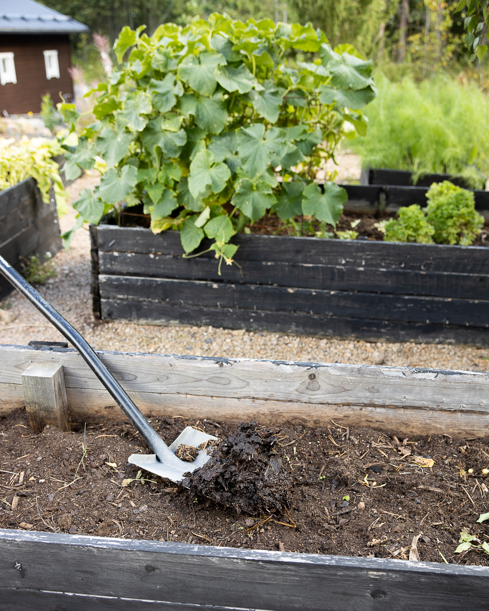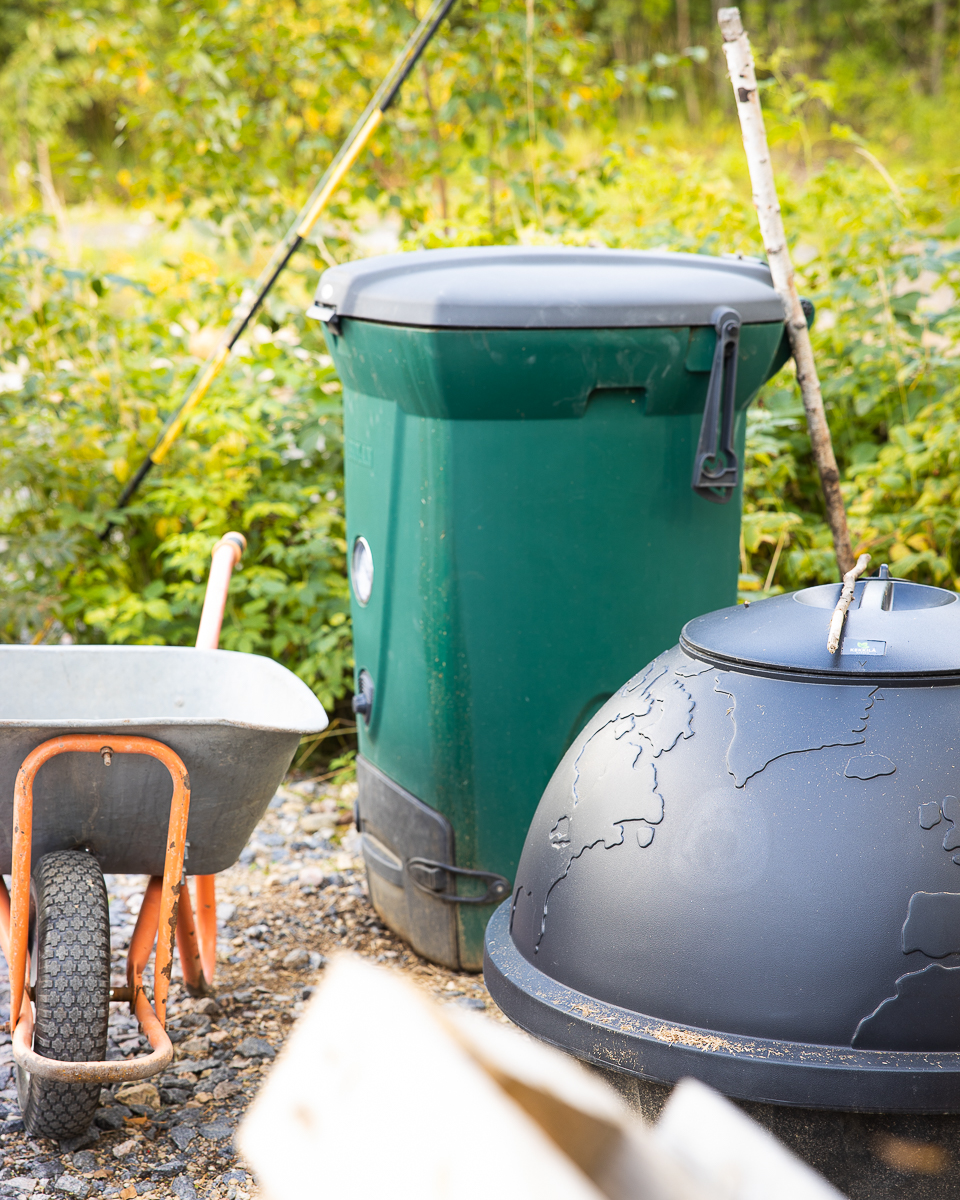 Luulen, että kompostoinnista innostuminen on yksi varmimpia keski-ikäistymisen merkkejä! Mutta oli miten oli, nyt kun meillä on mökillä kasvimaa, on kompostoinnista tullut tärkeä osa oman ruoanlaittohomman ja kasvimaan pyöritystä. Tuntuu järkevältä, että ravinteet kiertävät omassa puutarhassa ja omat keittiöjätteet kompostoimalla säästää paitsi rahaa, myös luontoa, koska usein turvetta tai rahkasammalta sisältävää multaa ei tarvitse ostaa kaupasta. Biojätteistä on tullut kompostoinnin myötä arvokasta tavaraa ja nykyään teenkin niin, että kuljetan biojätteet ämpärissä kaupungista mökille kompostoitavaksi, jotta mitään ei mene hukkaan.