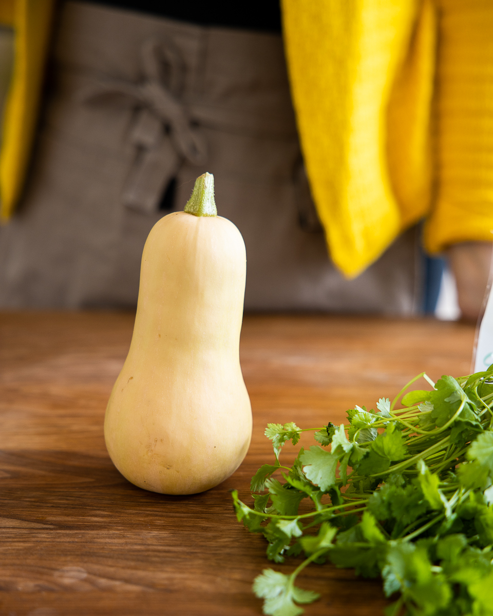 1. Kuori myskikurpitsa ja poista siemenet. Paloittele kurpitsa parin sentin paloiksi. Pilko porkkana, kuutioi sipuli ja hienonna valkosipulinkynnet. Poista lehtikaalista ruodit ja silppua lehdet.