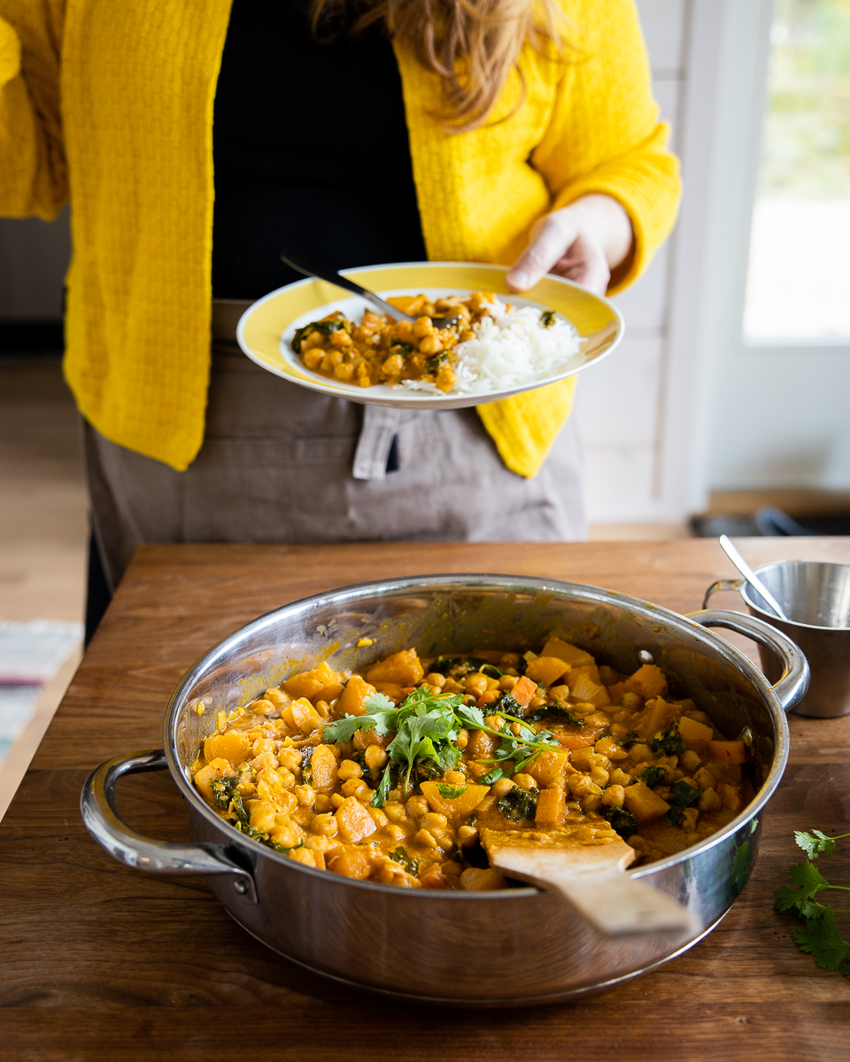 Saimme tänä vuonna mökillä kasvatettua yhden pienen myskikurpitsan! Tämä oli ensimmäinen kerta kun kasvatin kurpitsaa ja kylmä kevät taisi vähän verottaa satoa. Kokeilu oli kuitenkin hauska ja aion varmasti laittaa kurpitsaa kasvamaan myös ensi vuonna! Oman kurpitsan valmistaminen ruoaksi tuntuu juhlalliselta, joten halusin kokkailla siitä jotain erityisen hyvää. Ja koska syksy on mehevien pataruokien aikaa, upotin kurpitsan tähän ihanaan mausteiseen kikherne-kurpitsapataan, joka jalostetaan kookosmaidolla, maapähkinävoilla ja harissalla.