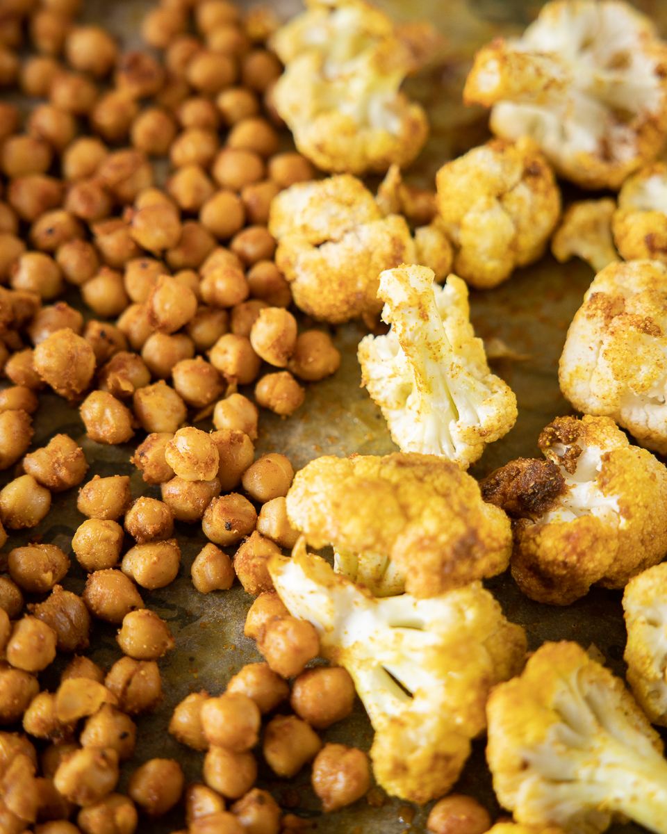 Tässä peltiruoassa kikherneet ja kukkakaalit maustetaan omilla mausteseoksillaan, vaikka ruoka valmistuukin yhdellä pellillä. Näin makuihin saa pientä vaihtelua.