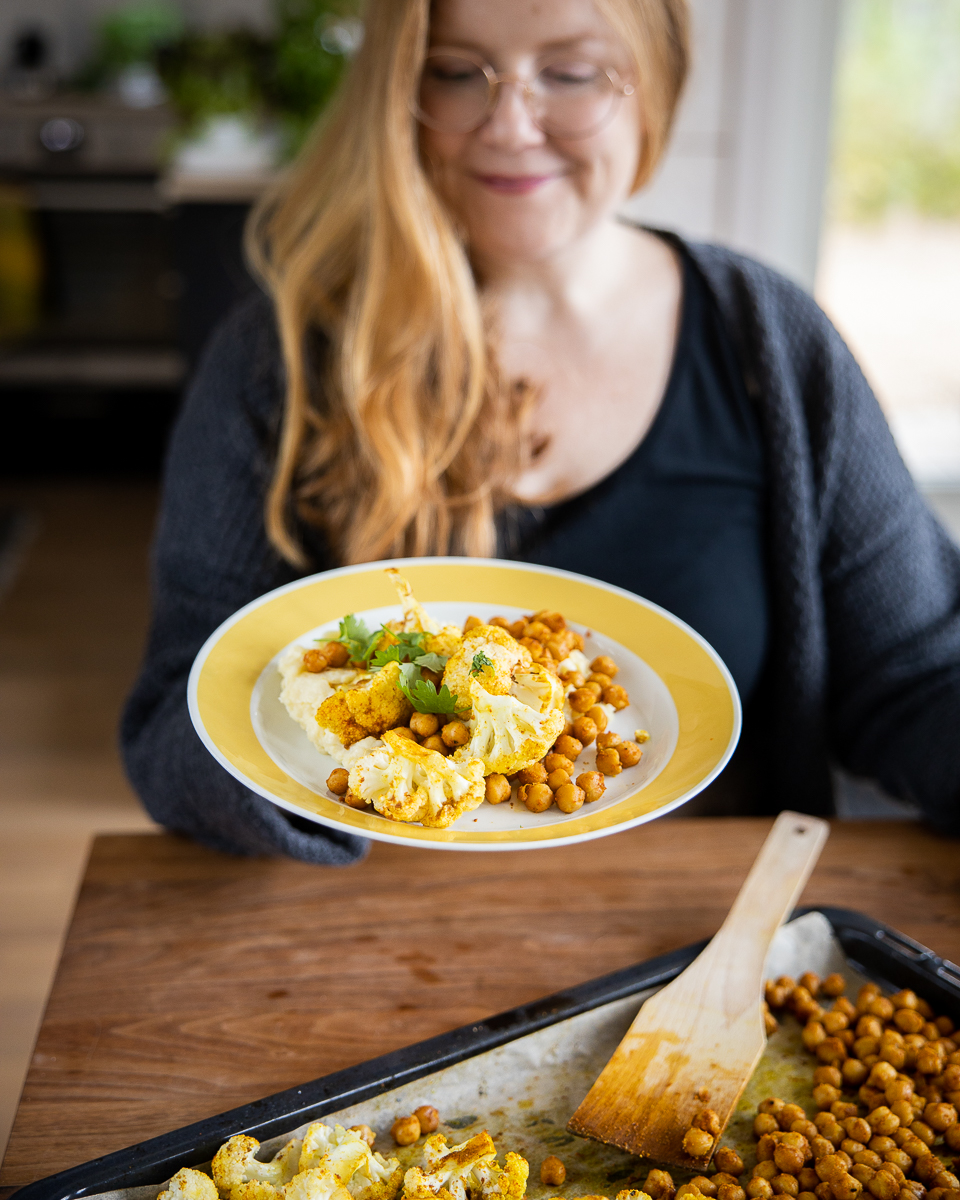 Olen syönyt tätä kikherne-kukkakaalipeltiä pitkin syksyä perunamuusin kanssa, jolloin erillistä kastiketta ei tarvita. Jos haluat oikaista arkena, perunamuusinkin voi valmistaa hyvin pakasteperunamuusiaineksista, joita löytyy vegaanisena esimerkiksi Apetitin valikoimista. Uunissa paahdetut mausteiset kasvikset sopivat moneen muuhunkin, joten kurkkaa vinkit reseptin alta.