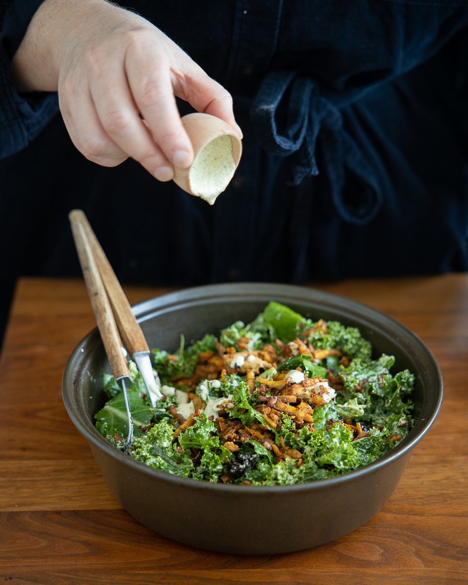 - Sekoita noin puolet kastikkeesta käsin hieroen lehtikaalin joukkoon. Lisää tofu ja leipäviipaleet. Jos haluat, lisää joukkoon vielä romaine-salaattia. Sekoita joukkoon loput kastikkeesta ennen tarjoamista. Tarkista suola.