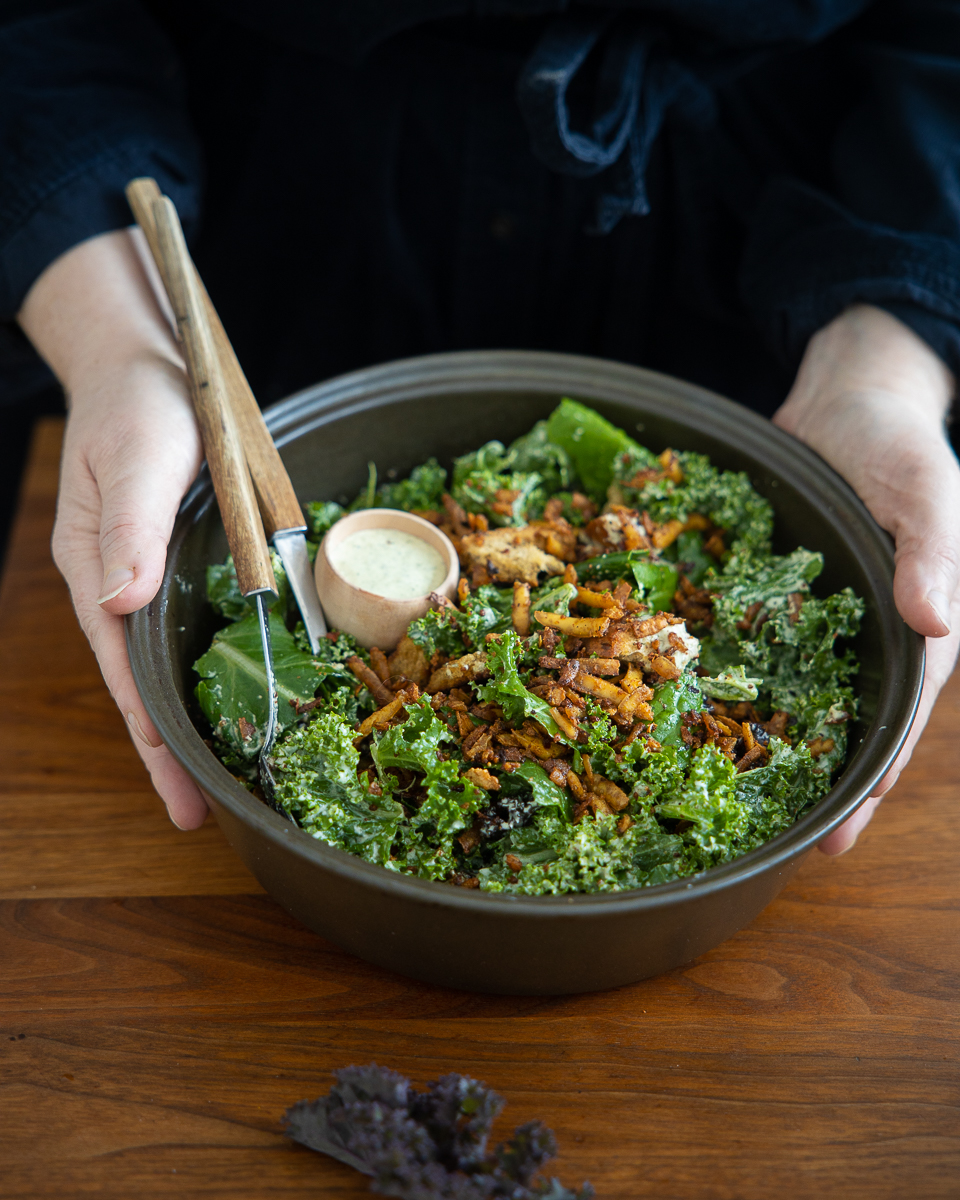 Caesarsalaatti lehtikaalista valmistettuna on yksi ihanimmista talvikauden salaateista. Kokkailin tätä taas, kun sain taannoin vanhempieni kasvimaalta puntillisen lehtikaalia. Tällä kertaa tein kaveriksi uunissa rapeaksi paahdettua tofua.