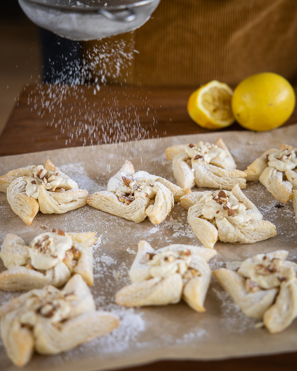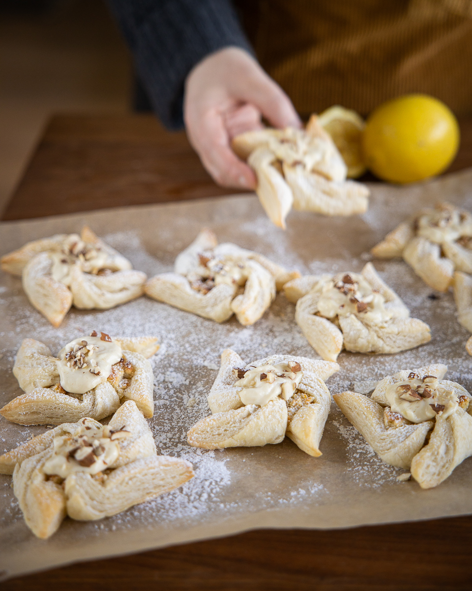 - Leikkaa lehtitaikina neliöiksi ja tee kulmiin viillot. Lusikoi jokaisen neliön keskelle noin 2 tl mantelitäytettä ja taittele tortut tähdiksi. Paina päät tiiviisti keskeltä kiinni.