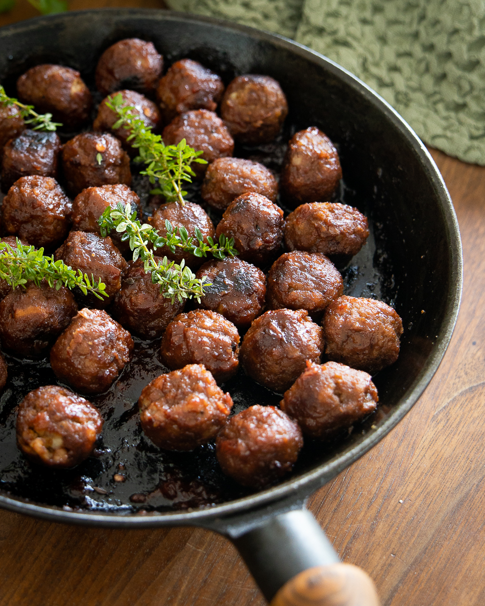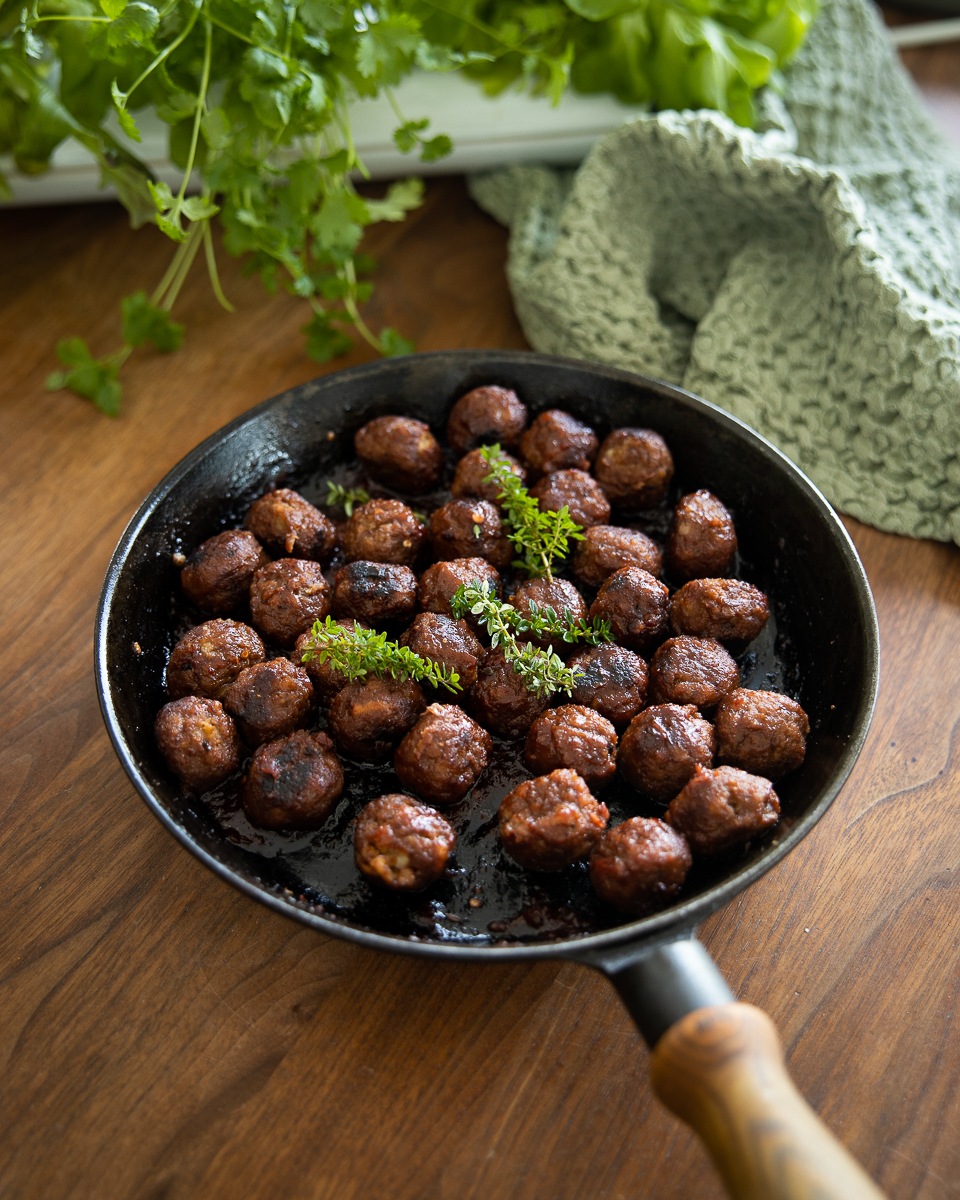 Kaupan valmiista kasvispyöryköistäkin saa helpolla tosi herkullisen ja juhlavan pääruoan joulupöytään! Pyörykät tuunataan itse keitetyllä, mutta tosi helposti valmistuvalla glaseerauskastikkeella. Pyöryköistä tulee tämän puolukkahillosta, appelsiinista ja tähtianiksista valmistetun kastikkeen avulla ihanan tahmaisia ja maukkaita.