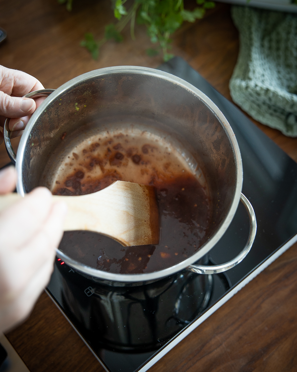 - Raasta appelsiinin kuori kattilaan. Purista joukkoon appelsiinin mehu ja lisää puolukkahillo, soijakastike, tähtianikset ja chilirouhe. Keittele keskilämmöllä välillä sekoitellen ilman kantta noin 5 minuuttia tai kunnes kastikkeesta on kiehunut kokoon noin puolet.