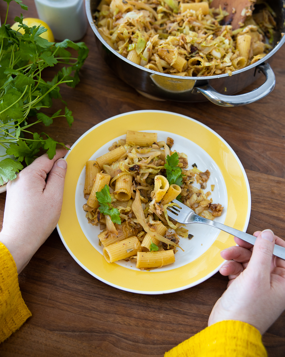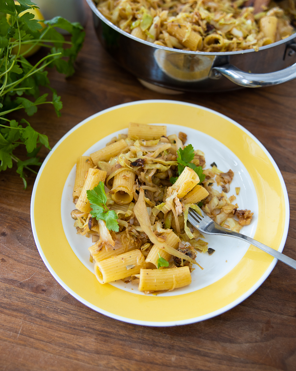 Muutama vuosi sitten The New York Times -lehden kaalipasta trendasi kaikkialla. Ehdin nyt taas vähän mattimyöhäisenä kaalipastatrendiin mukaan, mutta väittäisin, että tämä pasta ei mene koskaan pois muodista! En päässyt lukemaan alkuperäistä kaalipastan reseptiä, mutta tein ideasta oman vegaaniversioni. Misovoissa karamellisoitu kaali on ihan älyttömän hyvää ja aivan ihana makupari pastan ja pähkinöiden kanssa. Täydellistä talviruokaa!