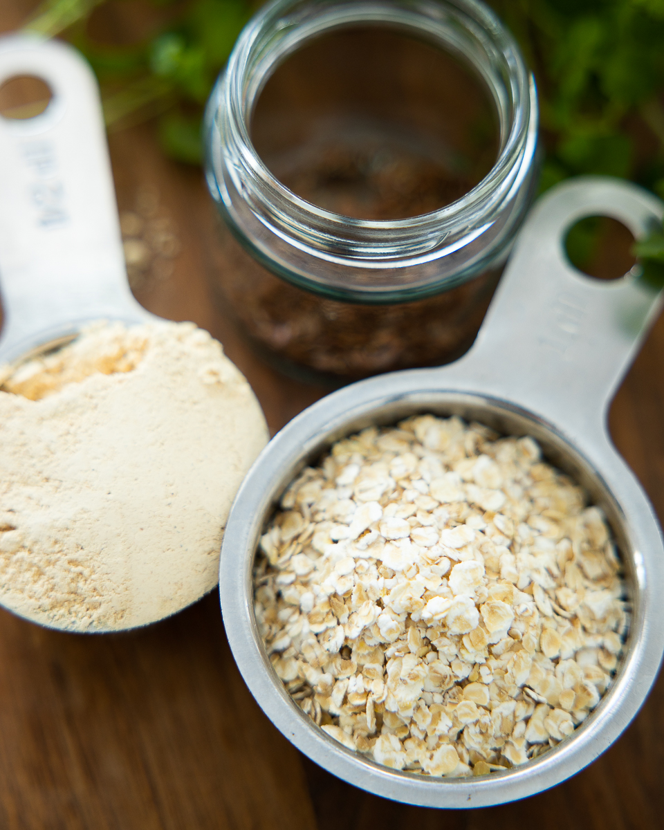 - Mittaa lasipurkkiin kaurahiutaleet, pellavansiemenet ja proteiinijauhe.