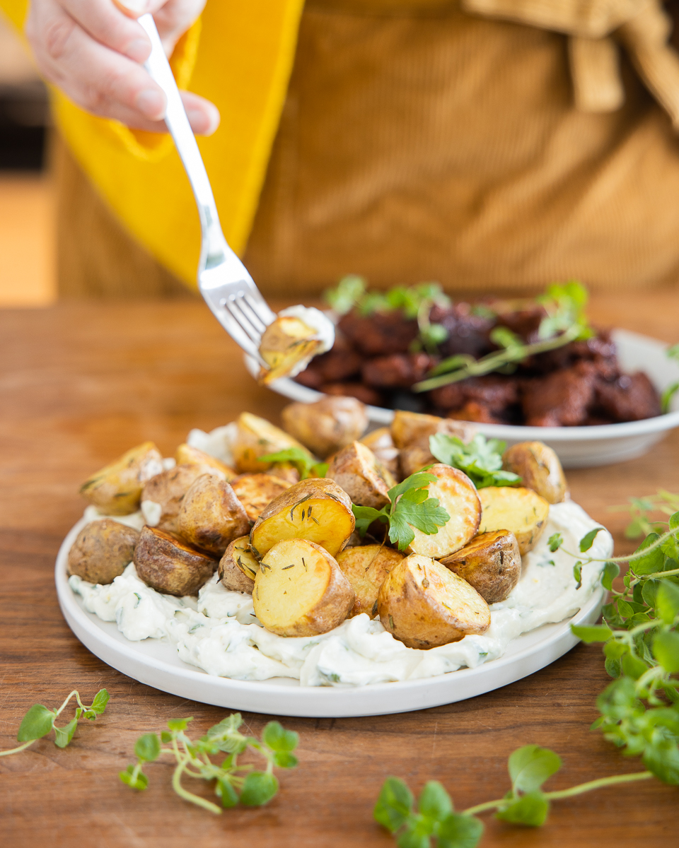 Pääsiäisen herkullisin lämmin lisuke on tässä! Tarjoa perunat esimerkiksi kirsikkaglaseeratun seitanin (resepti tulossa huomenna!) tai rapeiden savutofufileiden kanssa.