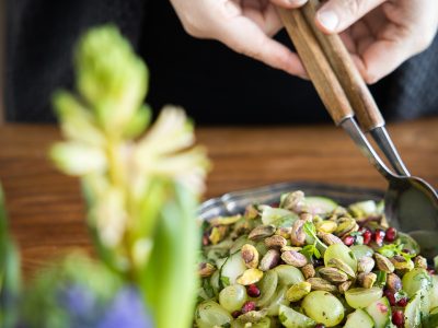Pistaasilla, granaattiomenoilla ja mintulla höystetty viinirypälesalaatti.