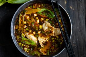 Fenkolilla, sahramilla ja sitruunalla maustettu kalaton keitto.