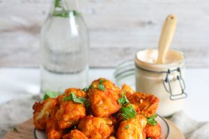 Täydellistä viikonloppuruokaa: kukkakaalista tehdyt siivet ja itse tehty vegaaninen Sriracha-majoneesi.
