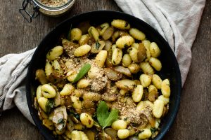 Taivaallisen hyvä gnocchi-maa-artisokkapaistos, jossa ei ole säästelty rasvaa, suolaa tai valkosipulia.