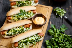 Helpot vegaaniset hodarit tarjotaan ihanan varhaiskaali-yrttisalaatin kanssa.