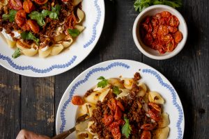 Orzo-pastaa hernekastikkeella ja varsiparsakaaleilla.