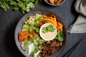 Tämä kulhoruoka sisältää mm. karamellisoitua gochujang-nyhtökauraa, nuudeleita, kimchiä ja kermaista seesamikastiketta.