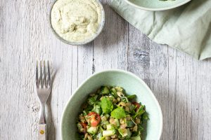 Raikas linssitabouleh tarjotaan herkullisen minttutahinin kanssa.