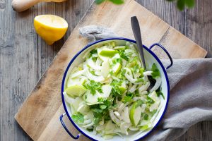 Simppeli, rapea ja sitruunainen omena-fenkolisalaatti valmistuu hetkessä.