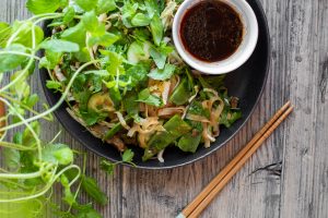 Helppo, raikkaan vihreä nuudelisalaatti härkäpapusuikaleista ja kauden kasviksista.