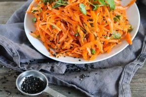 Korianterilla, seesaminsiemenillä ja sitrushedelmien mehulla tuunattu porkkanaraaste on superhyvää juuri nyt!