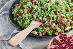 Parsakaalista tehty couscous, granaattiomena, paahdetut mantelit ja sitruunainen kastike = täydellinen lounas.