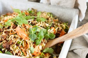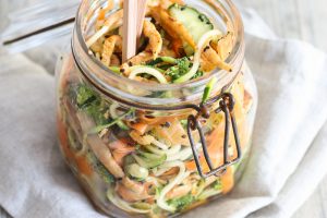 Kesäkurpitsanuudeleita ja soijasuikaleita sweet chili -kastikkeella. Oivaa lounasruokaa!