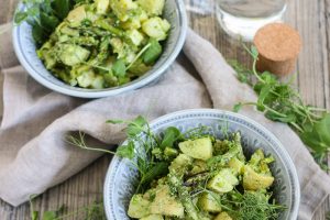 Keväisen vihreä parsa-perunasalaatti sopii myös vappupöytään!