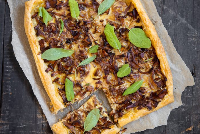 Metsäsienistä, sipulista ja herkullisesta juustokastikkeesta syntyy syksyn helpoin sienipiirakka!