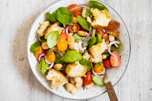 Alkusyksyn tomaattisato kannattaa upottaa tähän valkoisilla pavuilla höystettyyn klassikkosalaattiin.