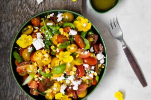 Ihana kesäinen lisukesalaatti grillatusta maissista ja tomaateista.