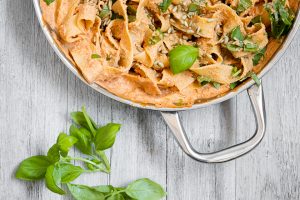 Tuoreista miniluumutomaateista, savutofusta ja auringonkukansiemenistä syntyy ihana täyteläinen pastakastike.