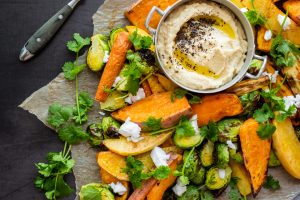 Pellillinen uunikasviksia erilaisten dippien kanssa on takuuvarma arkiruoka, joka taipuu tarvittaessa myös vähän paremmille illallisille.