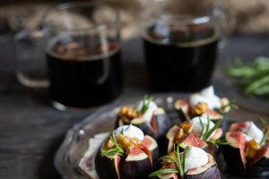 Tuoreet viikunat täytetään vegaanisella vuohenjuustolevitteellä, karamellisoiduilla saksanpähkinöillä ja rosmariinilla.