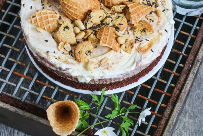 Maapähkinäinen vanilja-suklaajäätelökakku sulaa suuhun. Sopii tarjottavaksi vaikka äidille!
