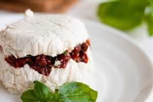 Aurinkokuivatuilla tomaateilla maustettu kermainen kanakastike vegaaniversiona.
