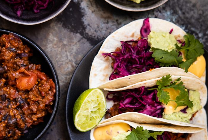 Herkulliset talviset tacot maukkalla Härkis-mustapaputäytteellä ja marinoidulla punakaalilla.