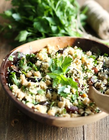 Täysjyväcouscousta, uunissa paahdettua munakoisoa, kuivattuja aprikooseja, kikherneitä ja tuoreita yrttejä. Kesän paras piknikeväs on valmis!