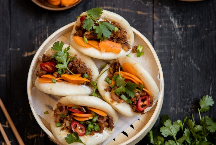 Karamellisoidulla nyhtökauralla ja hölskyporkkanoilla täytetyt aasialaiset höyrysämpylät.