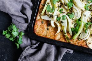 Suolainen vegaaninen pannukakku, joka on täytetty hummuksella ja paahdetuilla fenkoleilla. Nam!