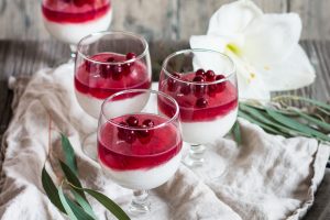 Kookosmaidosta valmistettu pannacotta glögikiilteellä sopii paitsi pikkujoulukemuihin, myös joulupöytään.