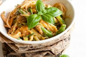Kantarelleja, kesäkurpitsaa, pensaspapuja ja sipulia, eli sesongin herkkuja täysjyväspagetin kera. Nam!