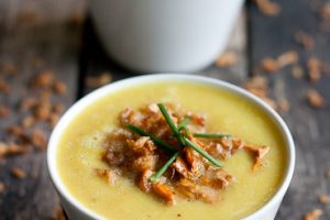 Kikherneillä ryyditetty kesäkurpitsakeitto, päällä paistettuja kantarelleja ja paahdettua sipulia. Nam!
