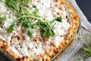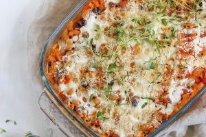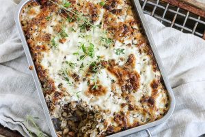 Makaronilaatikon vegaaninen sesonkiversio syntyy kantarelleista ja linsseistä. Nam!